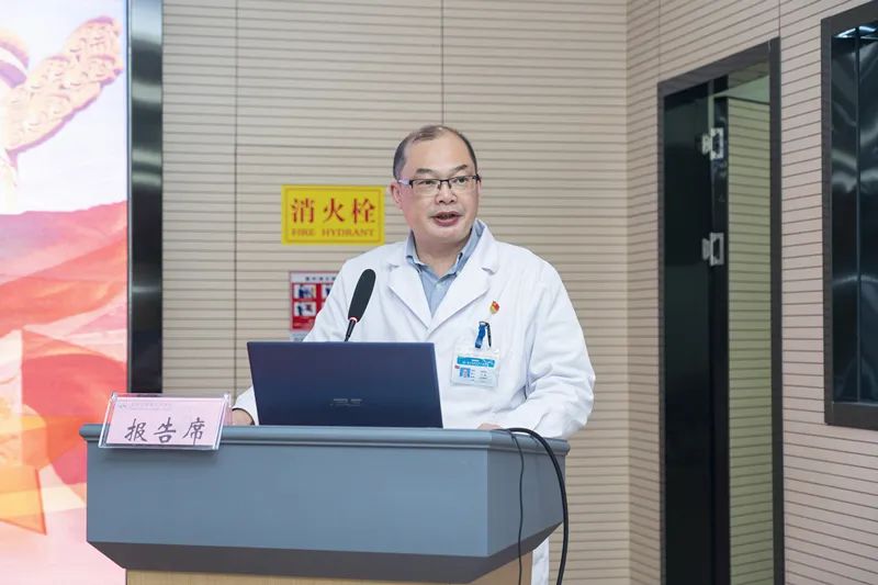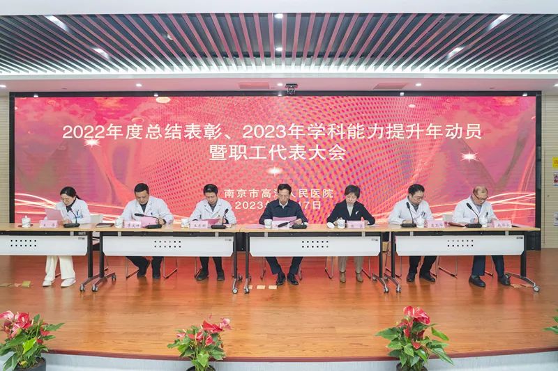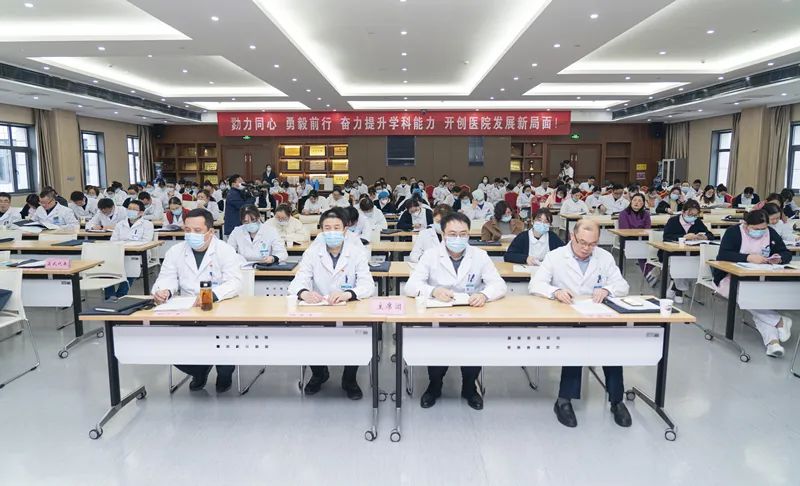 党委书记王东明作《2022年度总结表彰暨2023年学科能力提升年动员报告》。2022年全院上下坚持以习近平新时代中国特色社会主义思想为指导,深入学习贯彻党的二十大精神,全面落实“疫情要防住、经济要稳住、发展要安全”的要求,圆满完成各项目标任务。医院被江苏省卫生健康委员会确认为三级甲等综合医院,成功创建江苏大学附属高淳医院。荣获全区作风建设先进单位、南京市医疗保障系统先进集体、全区卫生健康先进集体等系列荣誉。2022年医院出院患者满意度全市第三,门诊患者满意度全市第七。突出党建引领,全面深入学习贯彻党的二十大精神;坚持“人民至上、生命至上”,全力做好疫情防控、救治工作;强化重点专科建设,开展“经脐单孔腹腔镜下全子宫切除术”“肩关节镜肩袖修补术”“Laennec入路腹腔镜解剖性肝切除的临床研究”等国内、省内先进新技术新项目;科教研协同发展,立项省卫健委重点课题1项、市卫健委重点课题1项,发表SCI 论文14篇,核心期刊论文31篇。持续推进医联体、医共体建设,深化与鼓楼医院合作,新开城北院区—南京市高淳人民医院医共体单位南京市高淳区妇幼保健院急诊科。2023年,我院将全面贯彻落实党的二十大精神,坚持以人民健康为中心、以党建引领为抓手、以学科能力提升为支撑,致力提高医疗服务健康能力,充分发挥区域龙头医院作用,切实提升群众认可度、满意度。