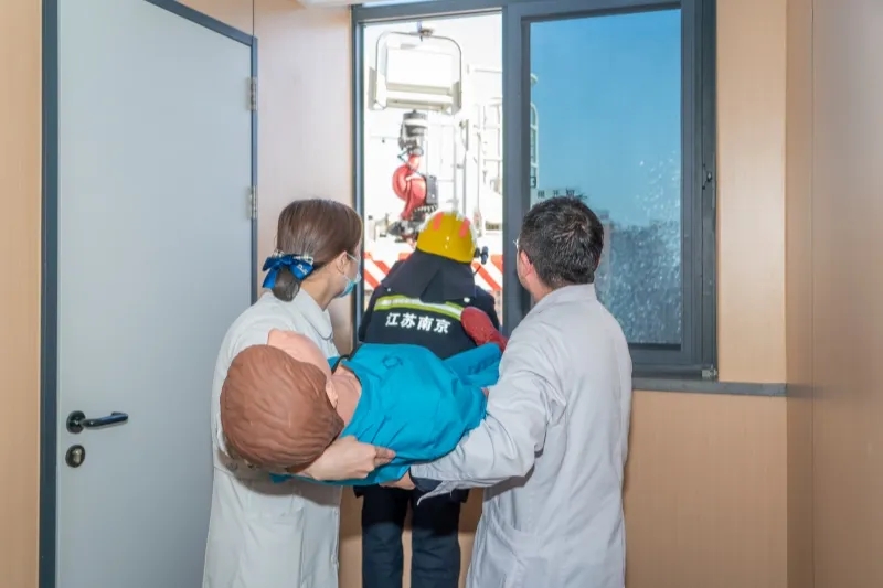 本次消防演练模拟医院住院楼12楼病区一病房发生火情,值班医务人员发现后第一时间启动病区消防应急预案,立即大声呼救并按下就近处墙上的手动火灾火警按钮,拨打医院消防监控室电话及向消防部门报警求助。同时迅速关闭火灾事发病房氧气总阀门,利用手提式灭火器处置初期火情。医护人员按照病区疏散指示开展病区人员疏散工作,疏散人员利用自己的胳膊捂住口鼻弯腰行进,从楼梯间往下疏散,无法自主行动的患者被撤离到病区避难间。消防监控室接到病区报警后,立即向分管院领导汇报,迅速启动医院消防应急预案,并通知医院微型消防站人员赶赴现场进行扑救。与此同时,高淳区消防救援大队开发区中队消防救援人员赶赴现场处置,架设云梯从消防救援窗解救被困人员,消防车同时对外墙立面进行喷水降温。整个演练过程历时半小时,参与演练人员分工明确、紧张有序,火灾报警、扑救、人员疏散、转移有条不紊,达到预期效果。