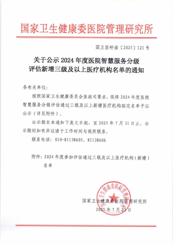 近日,国家卫生健康委医院管理研究所发布《关于公示2024年度医院智慧服务分级评估新增三级及以上医疗机构名单的通知》,南京市高淳人民医院在各级主管部门的指导和支持下,顺利通过智慧服务三级评审。这一阶段性成果既是对医院信息化建设工作的肯定,也激励我们继续深化数字化转型。在智慧医院建设过程中,医院始终坚持“以患者为中心”的服务理念,积极探索信息化与医疗服务的融合创新,持续优化诊疗服务流程,努力提升患者就医体验。医院也期待与医疗同行加强交流合作,共同探索适合基层医疗机构的智慧化建设路径,为推进健康中国建设贡献智慧和力量。