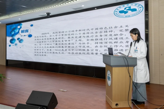 会上,周婧副院长系统汇报了医院2025年度整体工作成效与2026年发展目标,重点就上一年度院外行风监督员意见建议的整改落实情况进行详细说明,充分展现了医院广纳社会各界意见、持续推进内部优化的务实作风与坚定决心。